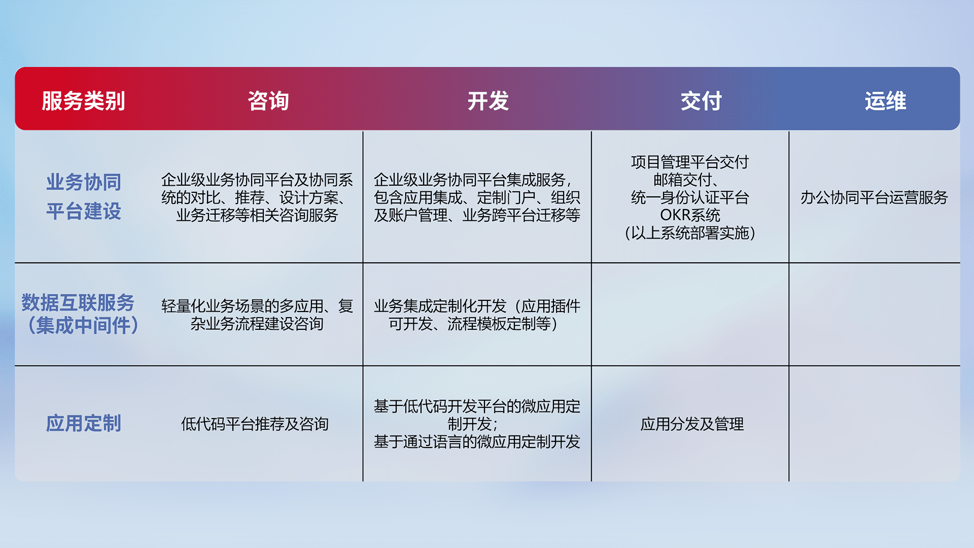 针对钉钉、、、、企微、、IDaas等平台级产品提供产品的规划、、方案、、交付、、、、定制化开发等服务,,,实现如统一协同办公、、、、智能客户服务、、混合会议管理、、、智能数据查询、、、等业务场景,,,实现数字化转型。。。。
