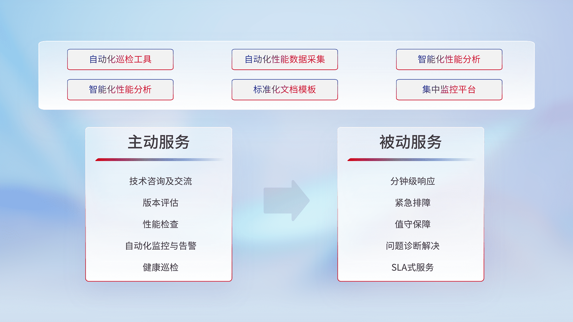 智能化工具和标准化文档,,,,保障服务质量,,,,提供主动服务(包含技术咨询、、、版本评估、、性能检查、、、、自动化监控与告警、、、、健康巡检)和被动服务包含(分钟级响应、、、紧急排障、、值守保障、、、问题诊断解决、、SLA服务)。。。。